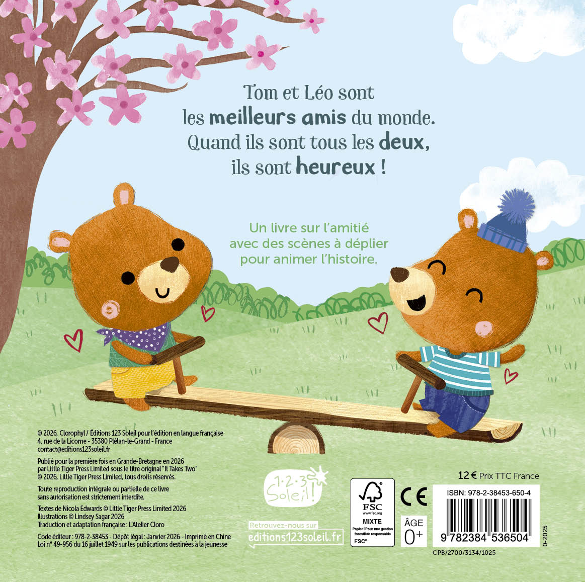 Le texte, tout en douceur, illustre les liens entre frères et sœurs ou meilleurs amis, au fil des sept doubles-pages cartonnées. Quatre grandes scènes en accordéon, percées de découpes, s’ouvrent comme des fenêtres sur l’histoire : elles donnent vie aux émotions et dévoilent, page après page, comment surmonter avec tendresse, les petits tracas de tous les jours. Un cadeau idéal pour les duos, à partir de 18 mois.
