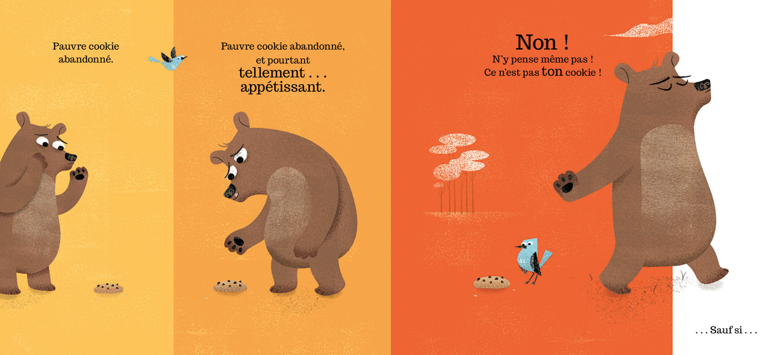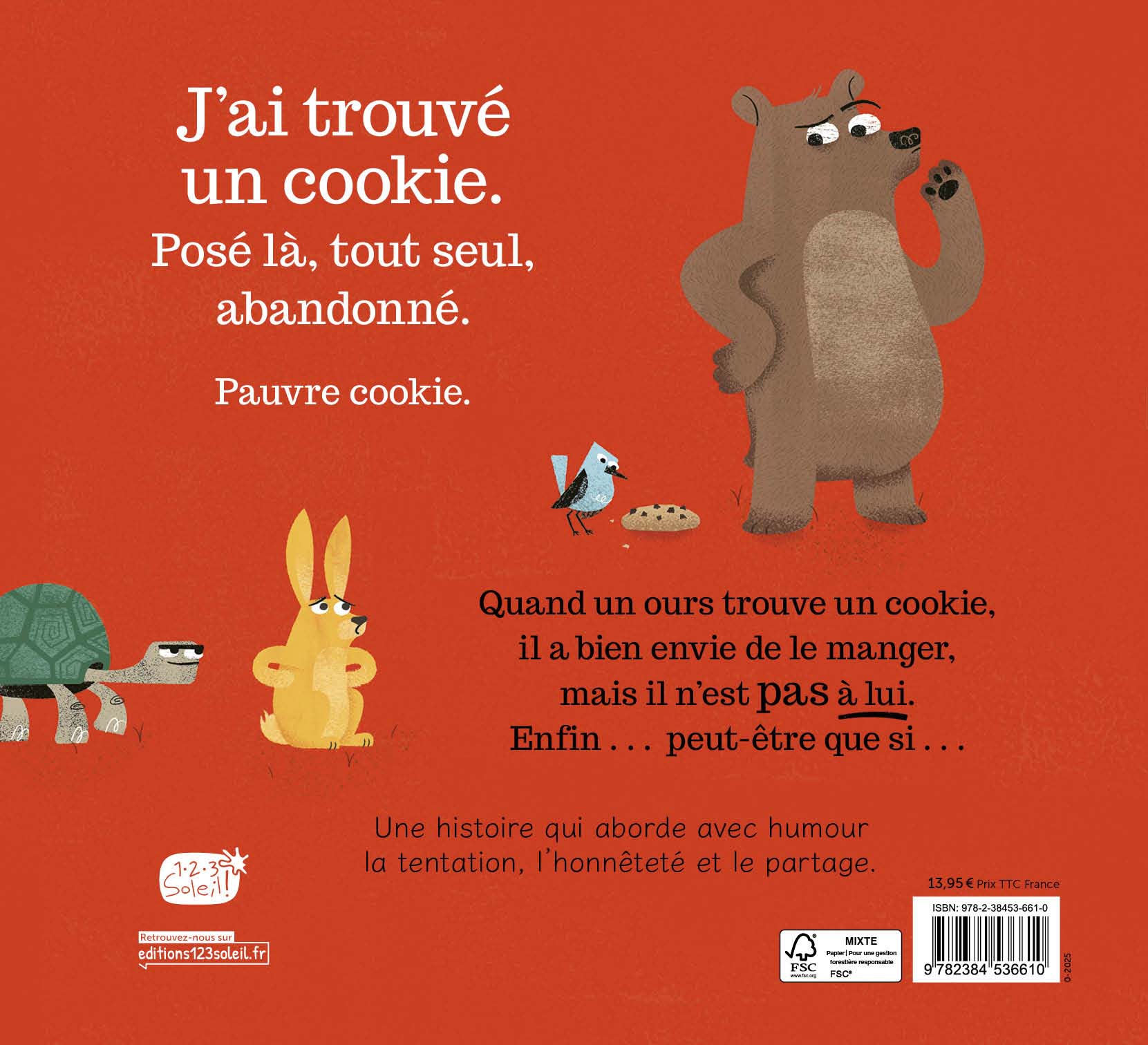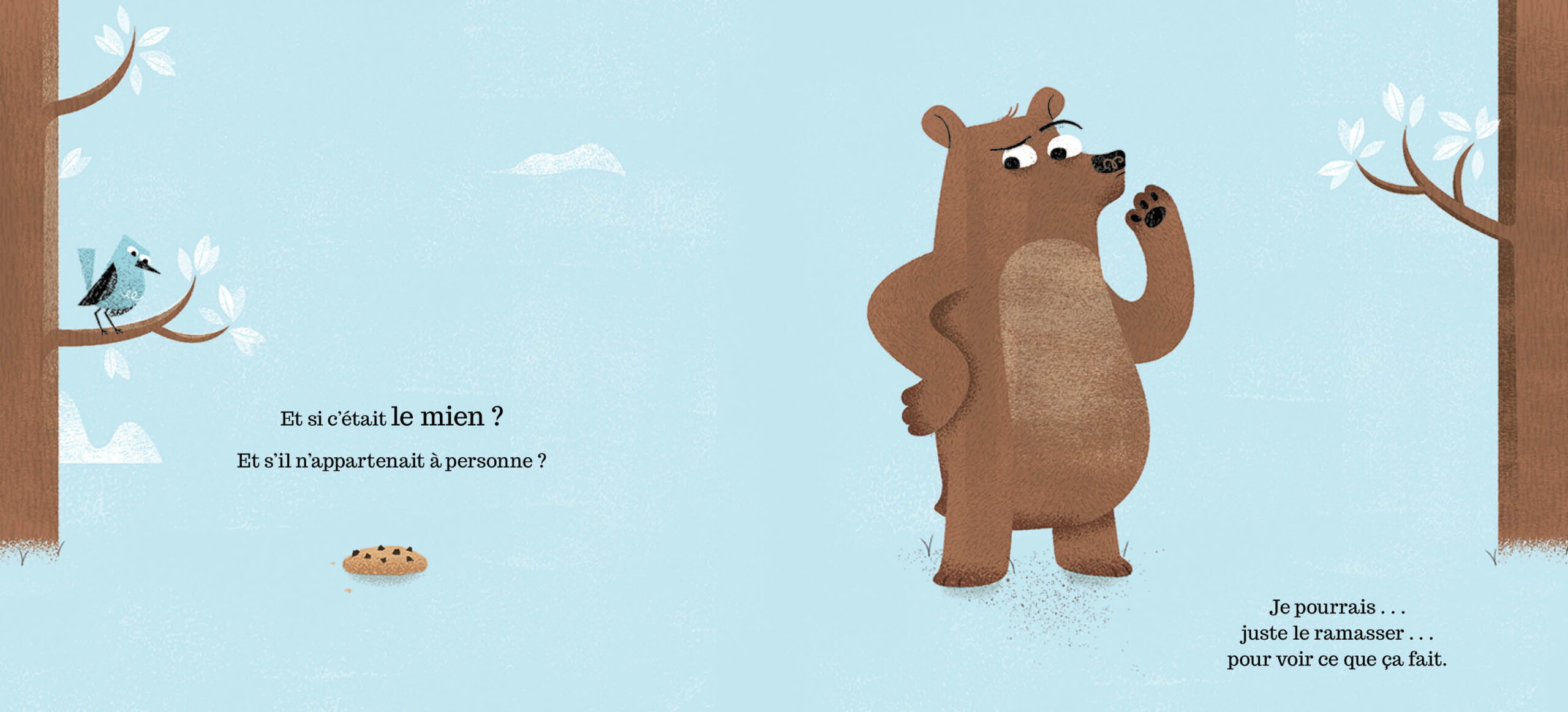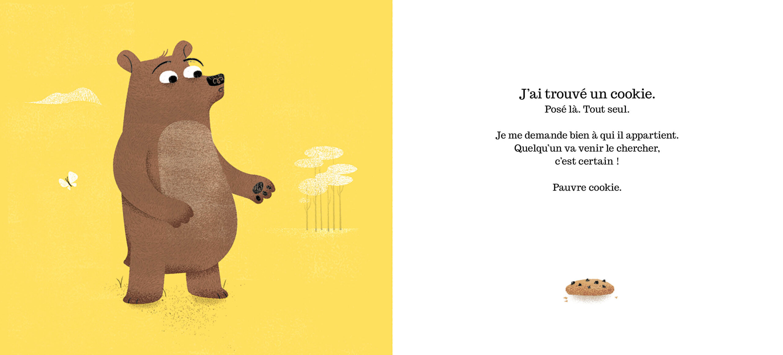 Un ours, un cookie… et un gros dilemme ! Quand un ours découvre un cookie abandonné, il est tiraillé entre l’envie et la raison. Il essaie de résister, il ment à ses amis et finit par s’en convaincre : le cookie est bien à lui ! Mais lorsque le vrai propriétaire arrive, les choses se compliquent… Les jeunes lecteurs riront des excuses de l’ours tout en réfléchissant aux notions de partage et d’honnêteté. Entre tentation et mauvaise foi, un album drôle et malicieux à lire en famille.