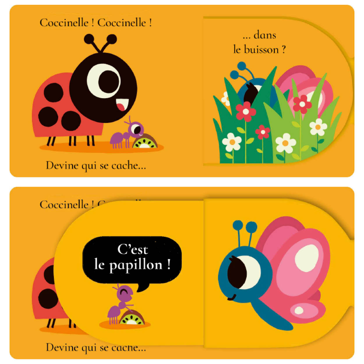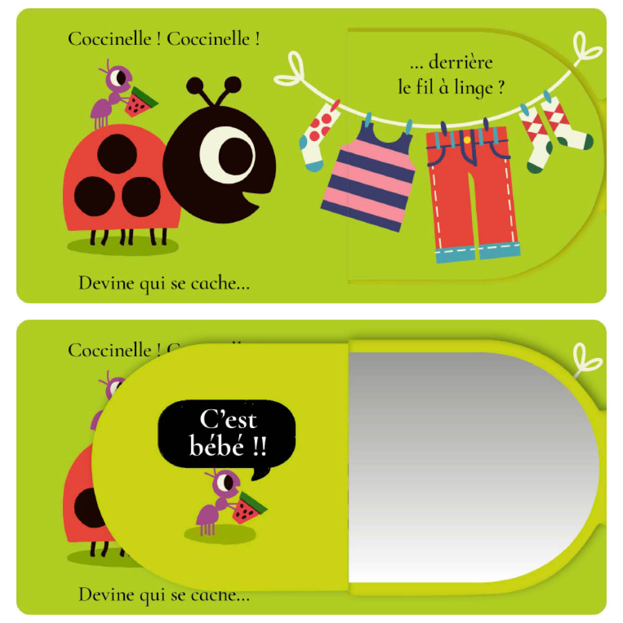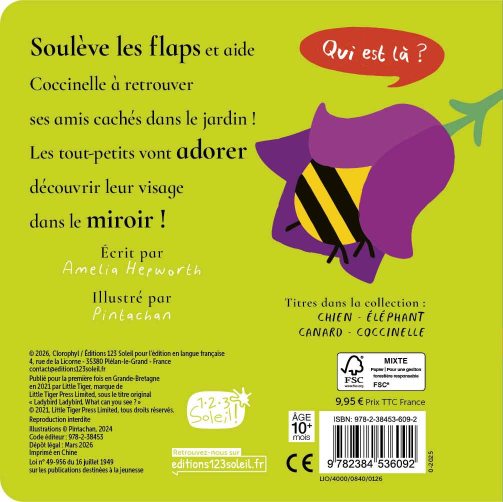 Un album cache-cache avec flaps et miroir, irrésistible pour les tout-petits ! “Coccinelle, coccinelle, devine qui se cache dans la pomme ? C’est le ver de terre !” Cette adorable collection propose cinq questions et cinq grands flaps à soulever. Les illustrations sont de grande taille pour capter l’attention des tout-petits. Sous le dernier flap, bébé va découvrir son visage dans un miroir : éclats de rire garantis ! Les pages et les flaps sont en carton épais pour être facilement manipulés par les petites mains.