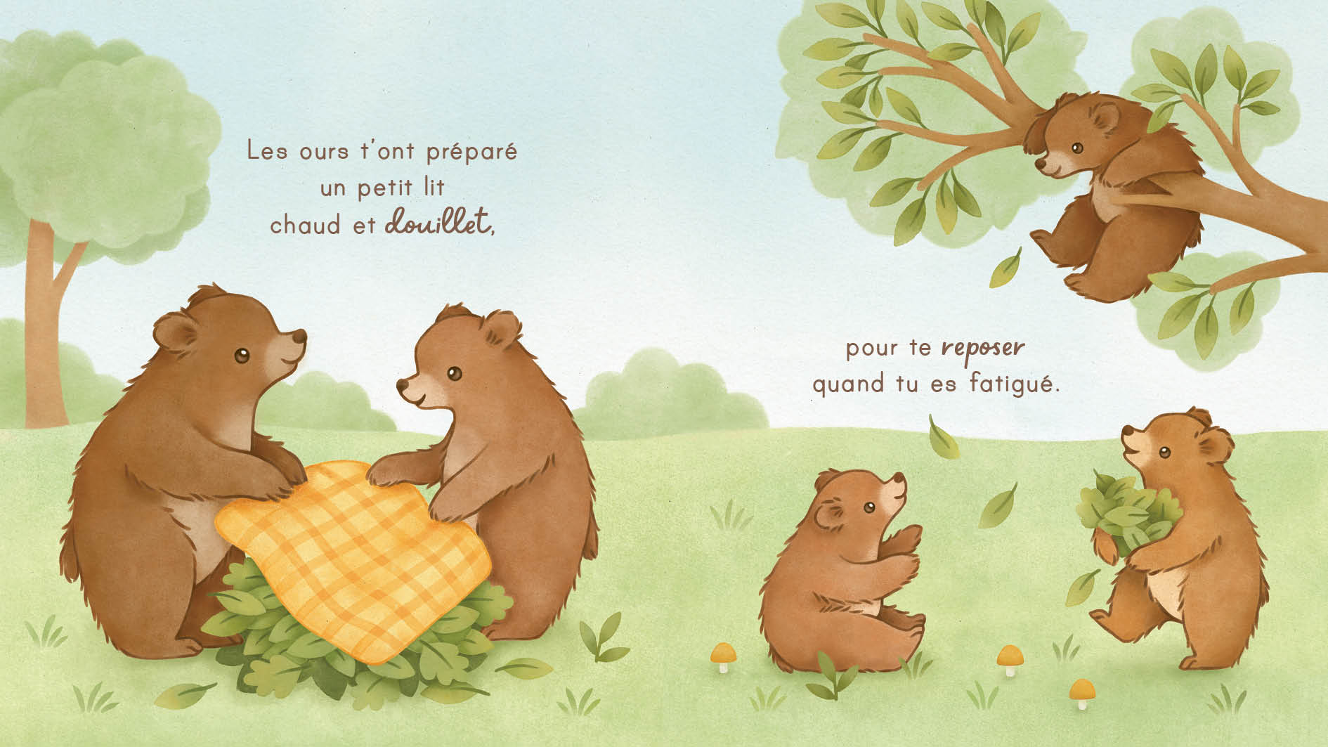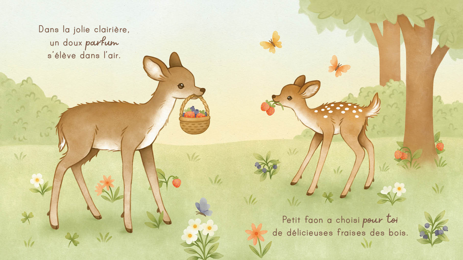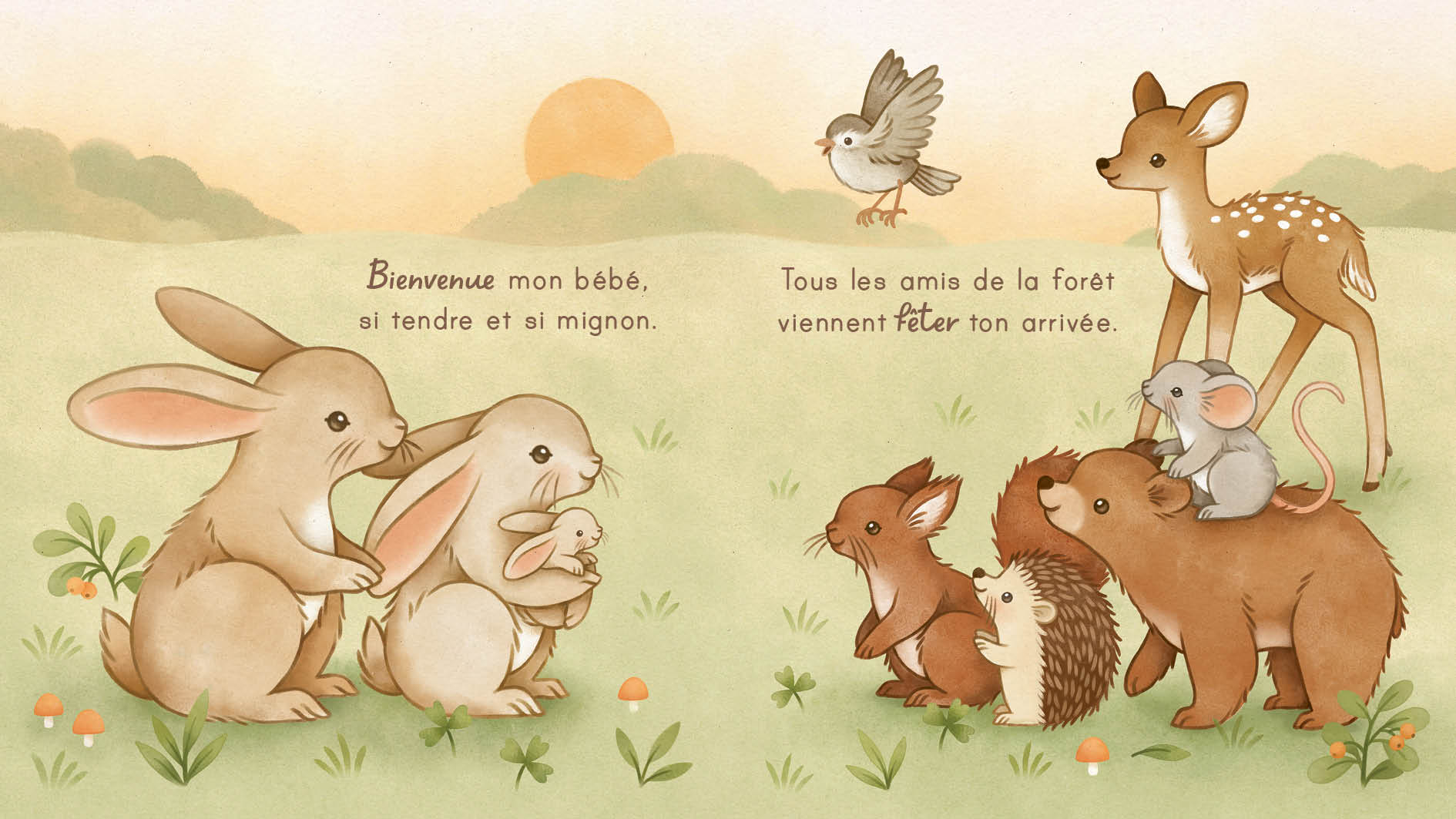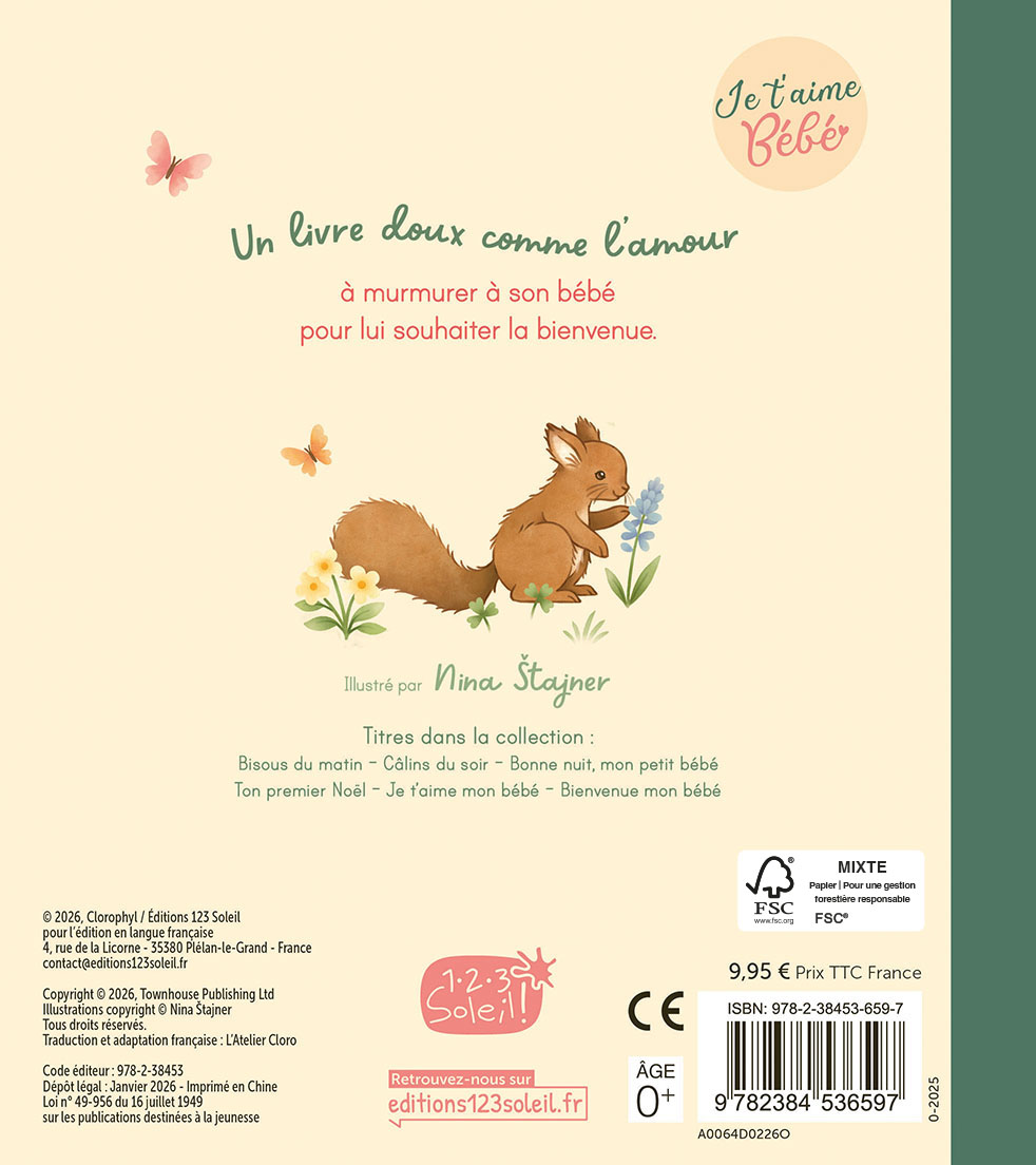 Un livre tendre comme un câlin, à murmurer à son bébé dès la naissance. Tous les amis de la forêt fêtent la naissance de bébé faon : ours, écureuils et oiseaux offrent chacun un présent symbolique, jusqu’au câlin final plein de tendresse. Ce livre poétique et lumineux illustre la douceur du lien affectif. Les aquarelles de Nina Štajner plongent le lecteur dans un univers tendre et apaisant. Le texte court, parle de joie et d’amour, avec des rimes choisies. Blotti contre son parent, bébé écoute le son réconfortant de la voix et partage un moment de complicité qui renforce le lien et éveille les sens. Un cadeau idéal, pour découvrir les bienfaits de la lecture dès la naissance.