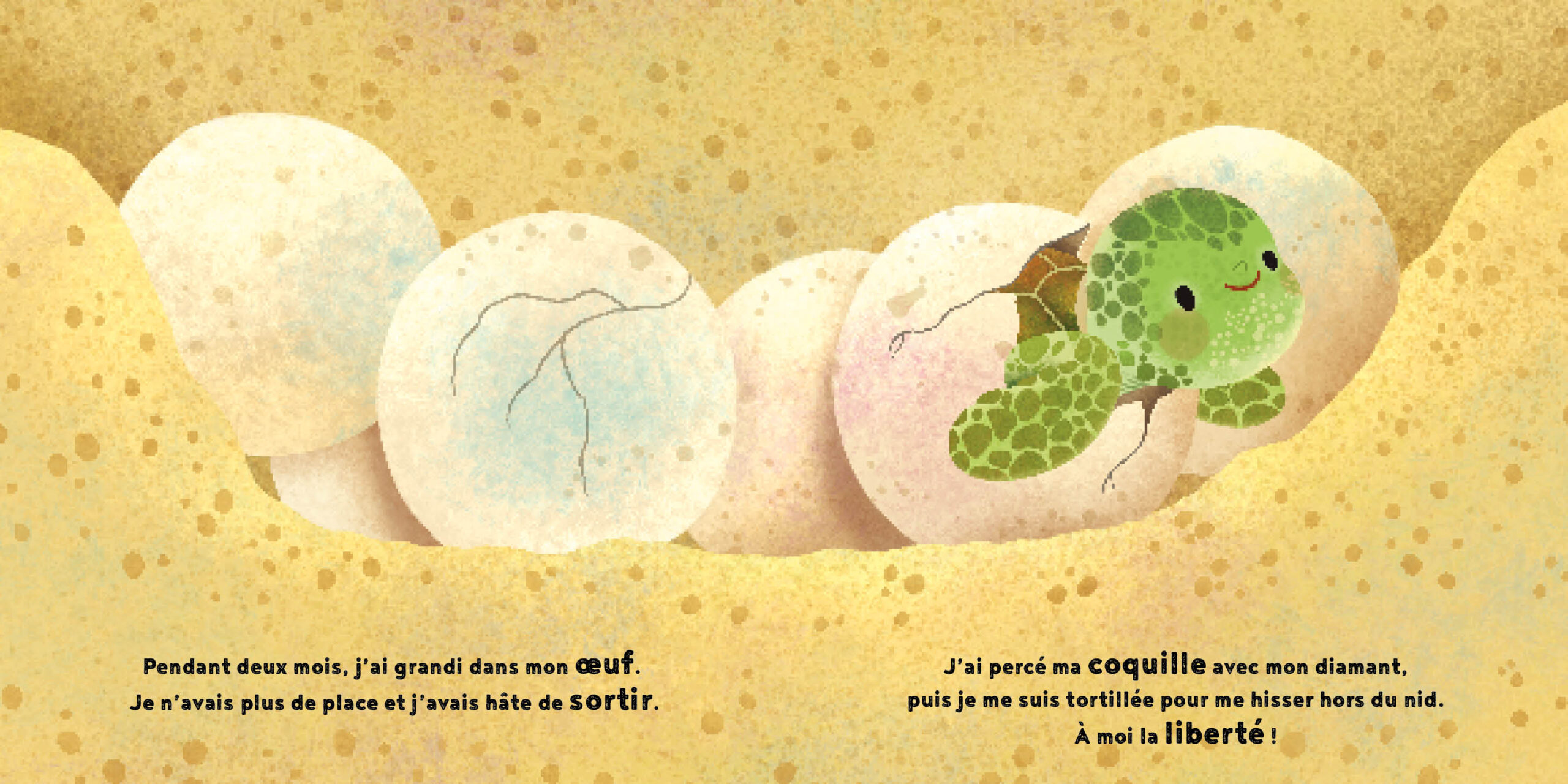 Pendant deux mois, j’ai grandi dans mon œuf. Je n’avais plus de place et j’avais hâte de sortir. J’ai percé ma coquille, puis je me suis tortillée pour m’extraire du nid…