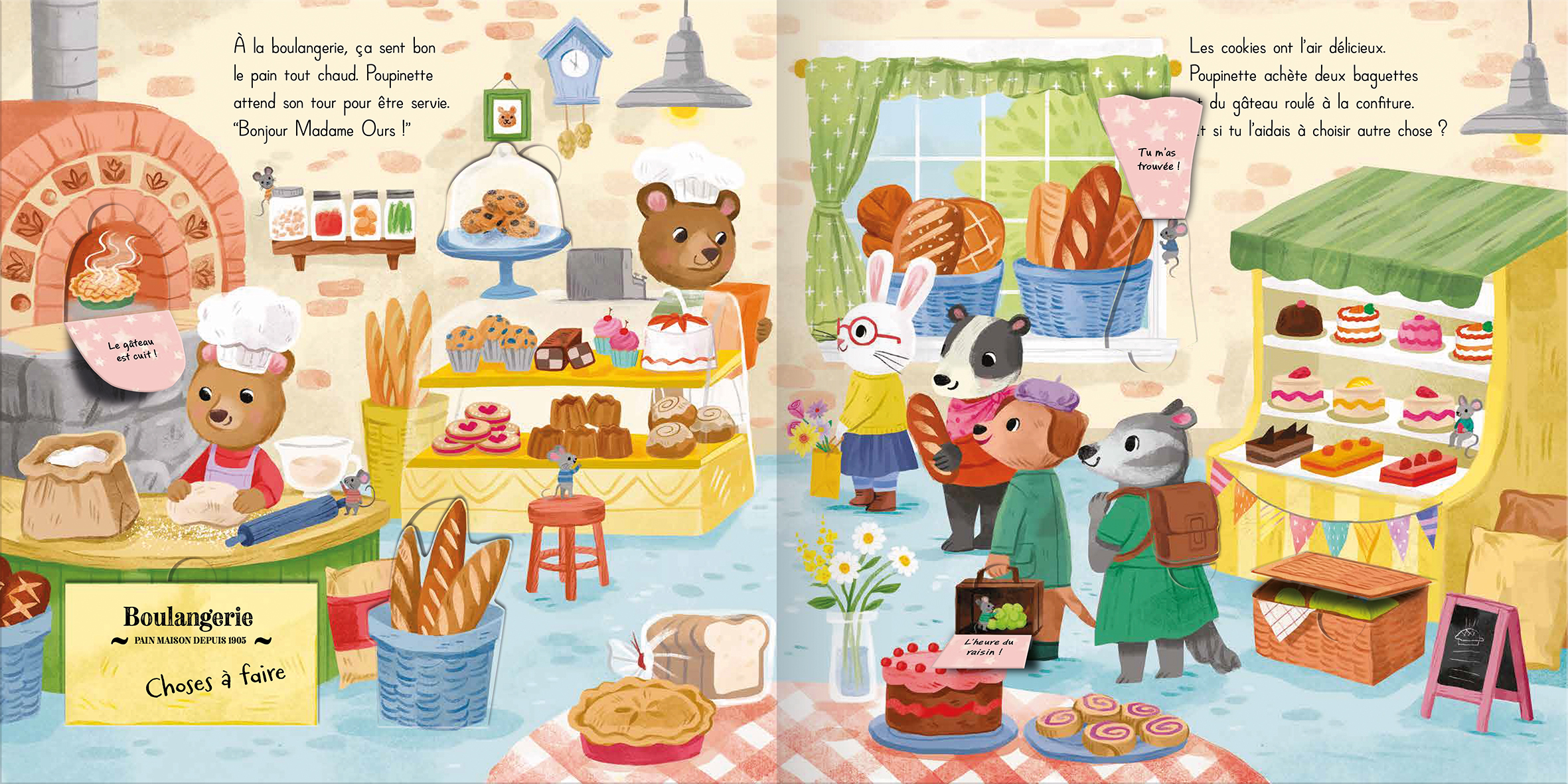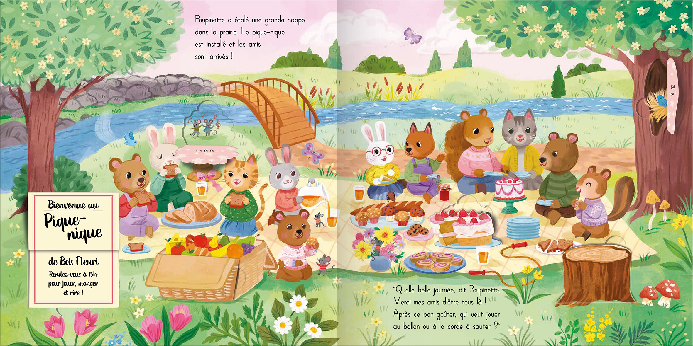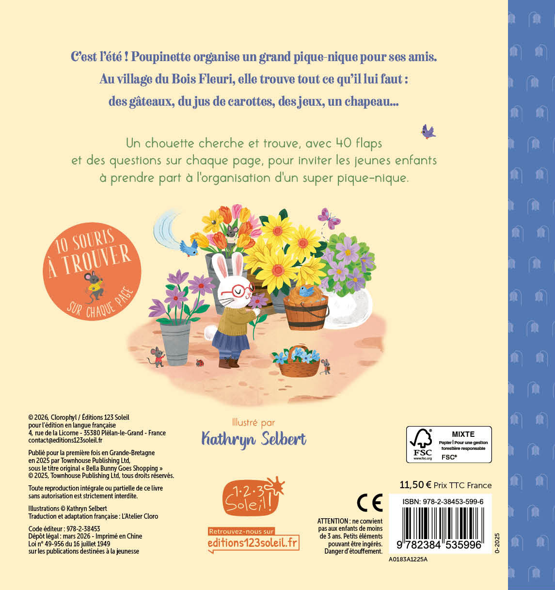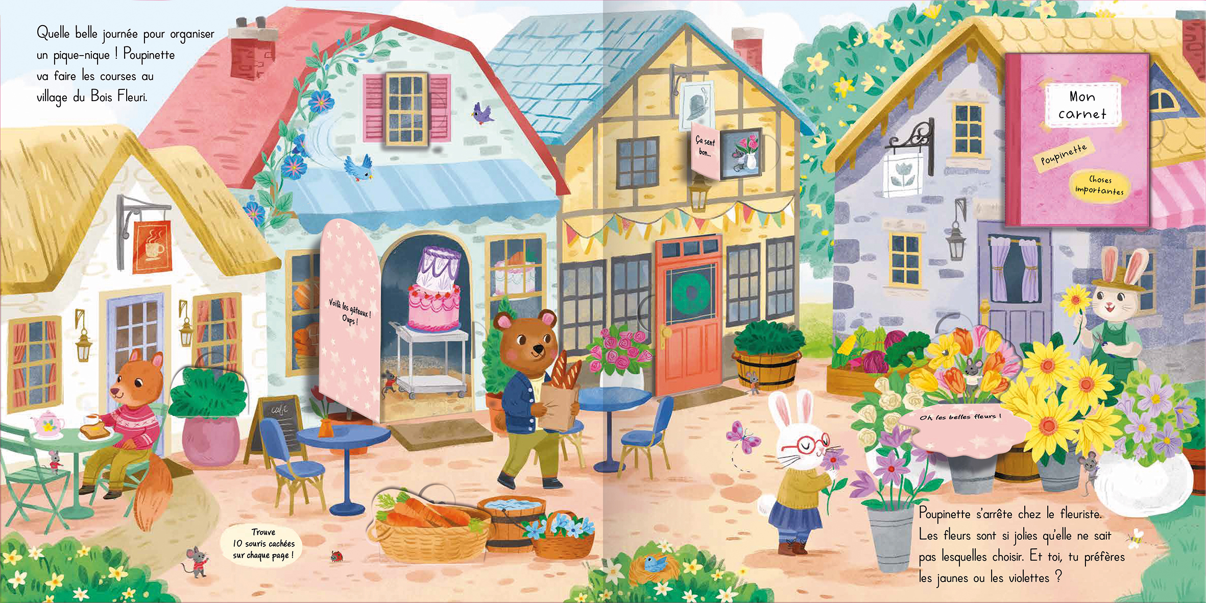 Un cherche et trouve plein de douceur, avec 40 flaps à soulever ! Dans le charmant village du Bois Fleuri, les jeunes lecteurs aident Poupinette à faire ses emplettes pour organiser un grand pique-nique. Entre la boulangerie, la boutique de jouets et le salon de thé, elle rassemble tout le nécessaire pour une belle journée d’été : pain chaud, gâteaux, boissons, ballon et chapeaux !