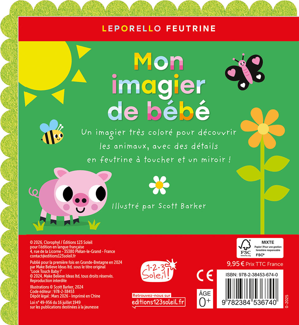 Un imagier sensoriel et coloré pour éveiller la curiosité des tout-petits. Avec ses détails en feutrine et son miroir intégré, ce livre accordéon accompagne bébé dans sa première découverte des animaux. Côté recto, les illustrations sont joyeuses et colorées. Côté verso, les images en noir et blanc stimulent la vision des tout-petits avec des formes et des contrastes forts qu’ils perçoivent dès les premières semaines. Un cadeau de naissance idéal pour regarder, toucher, s’éveiller !