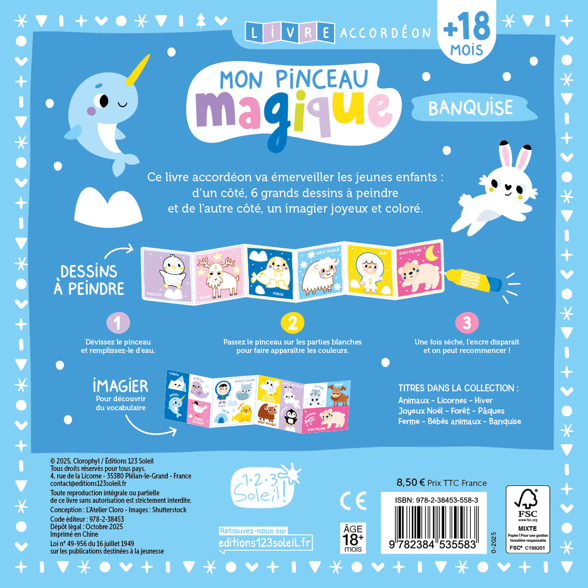 Ce livre accordéon grand format se déplie recto verso : d’un côté 6 grands dessins à peindre avec un pinceau magique à l’eau et de l’autre côté un imagier joyeux et coloré, pour découvrir de nouveaux mots de vocabulaire. Déplié, ce joli leporello fait une belle décoration dans la chambre de l’enfant.
