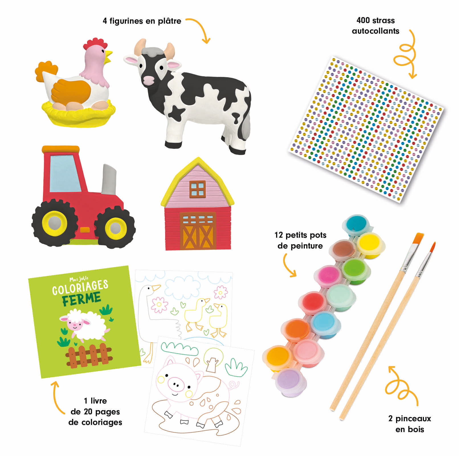 Un coffret très complet pour peindre et décorer 4 figurines en plâtre. Dans ce coffret, les jeunes enfants -et les plus grands- vont trouver 4 figurines en plâtre (une grange, une vache, un tracteur et une poule), 12 petits pots de peinture, 2 pinceaux en bois (un plat et un fin), un livret de 20 coloriages et plus de 400 strass autocollants pour réaliser de superbes décorations. Une chouette activité créative à partager en famille !