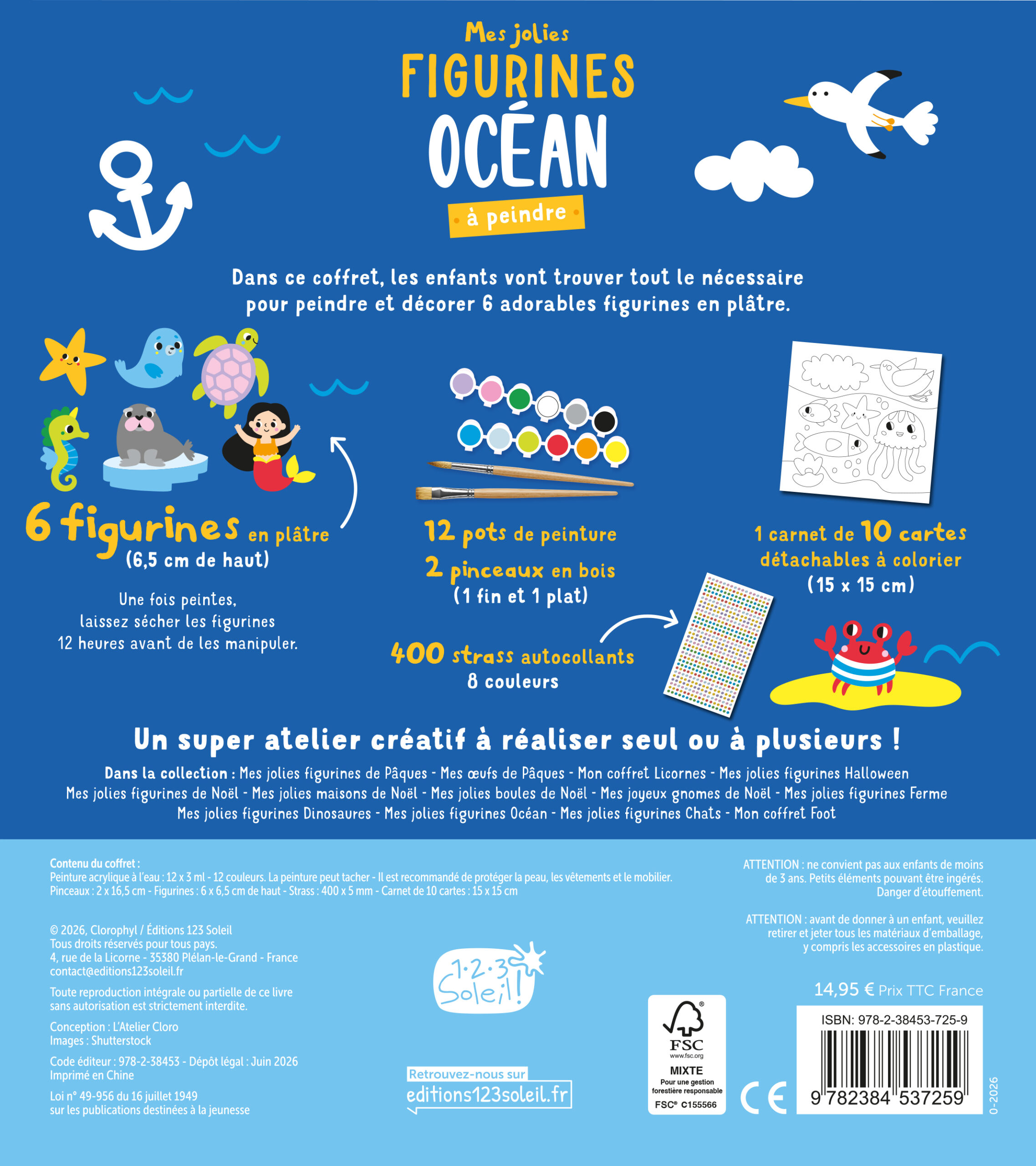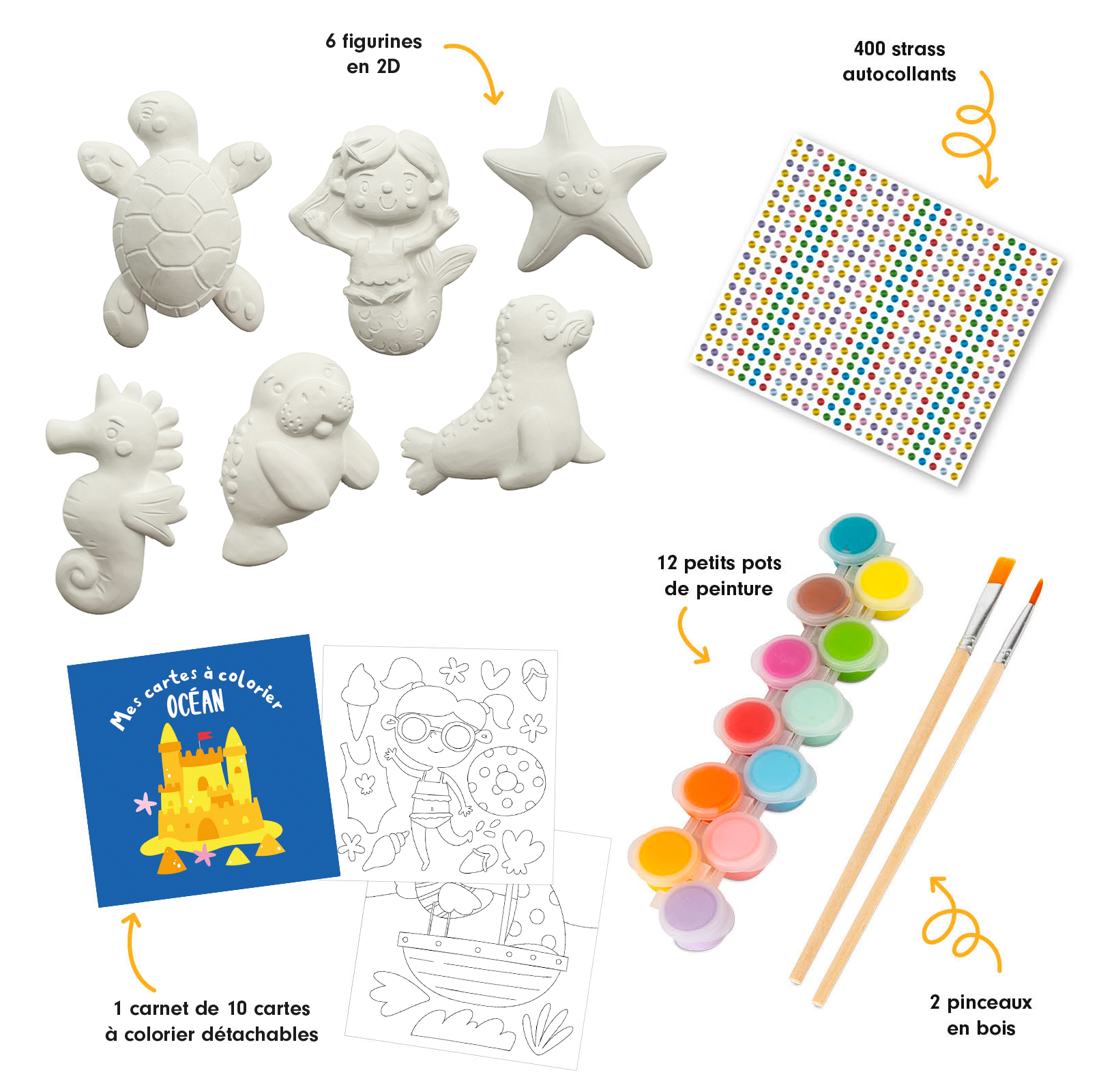 Un coffret très complet pour peindre et décorer 6 figurines en plâtre. Dans ce coffret, les jeunes enfants -et les plus grands- vont trouver 6 figurines en plâtre (une étoile de mer, un phoque, une tortue, un hippocampe, une sirène et un morse), 12 petits pots de peinture, 2 pinceaux en bois (un plat et un fin), 10 cartes à colorier et plus de 400 strass autocollants pour réaliser de superbes décorations. Une chouette activité créative à partager en famille !