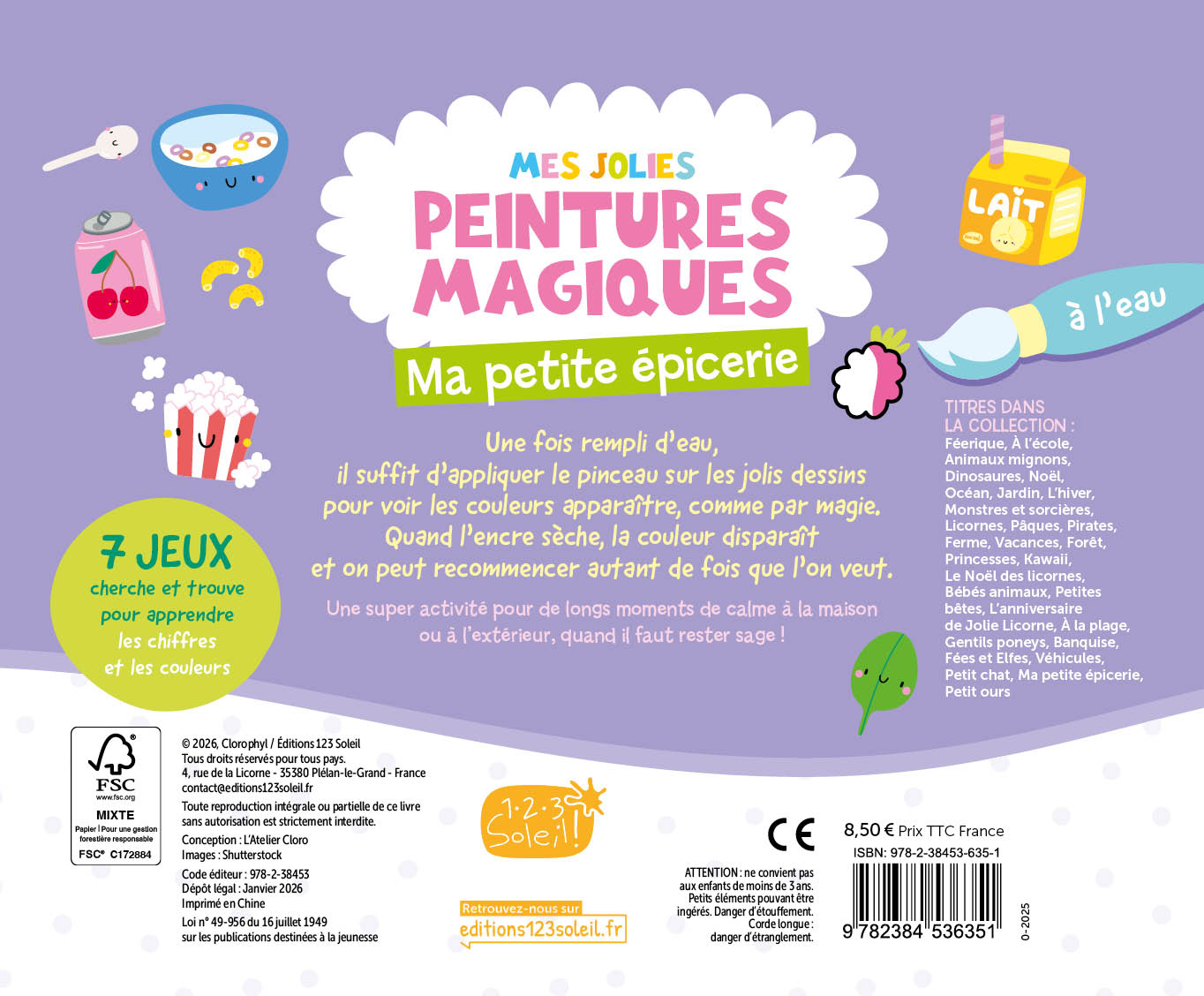 Les tout-petits n’ont plus besoin de tablier pour faire de la peinture. Il suffit de remplir le réservoir du pinceau avec de l’eau. puis de le passer sur l’un des dessins pour que des couleurs éclatantes apparaissent comme par magie ! Une dizaine de minutes plus tard. la page est sèche et la couleur disparaît. On peut recommencer autant de fois que l’on veut ! Au verso de chaque page. un jeu invite à repérer des objets et à les compter. Une joyeuse façon d’apprendre en s’amusant !
