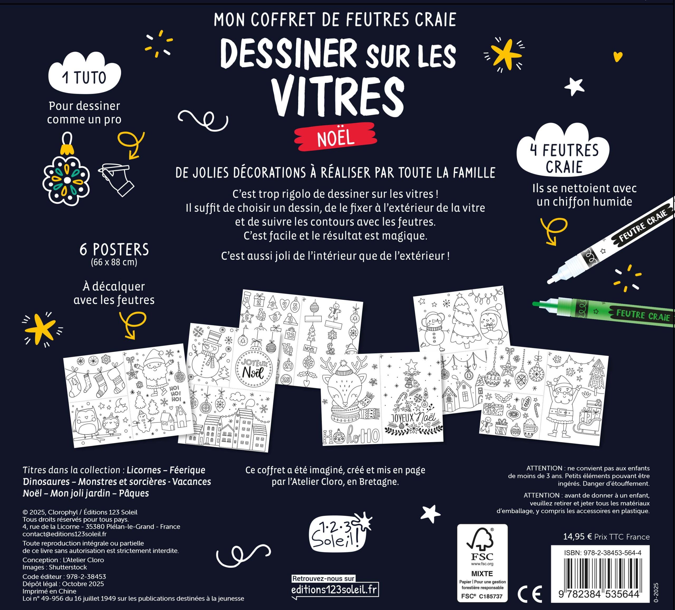 C’est si joli de dessiner sur les vitres. Et c’est aussi très amusant. Voilà une activité qui va enchanter toute la famille ! C’est facile, il suffit de choisir un dessin, de fixer le poster côté extérieur et de décalquer les contours avec le feutre craie. Avec quatre couleurs, c’est encore plus joli ! Le Père Noël et son traîneau, un joli village sous la neige, une guirlande de bouls de Noël… Les dessins sont poétiques et le résultat est magique.