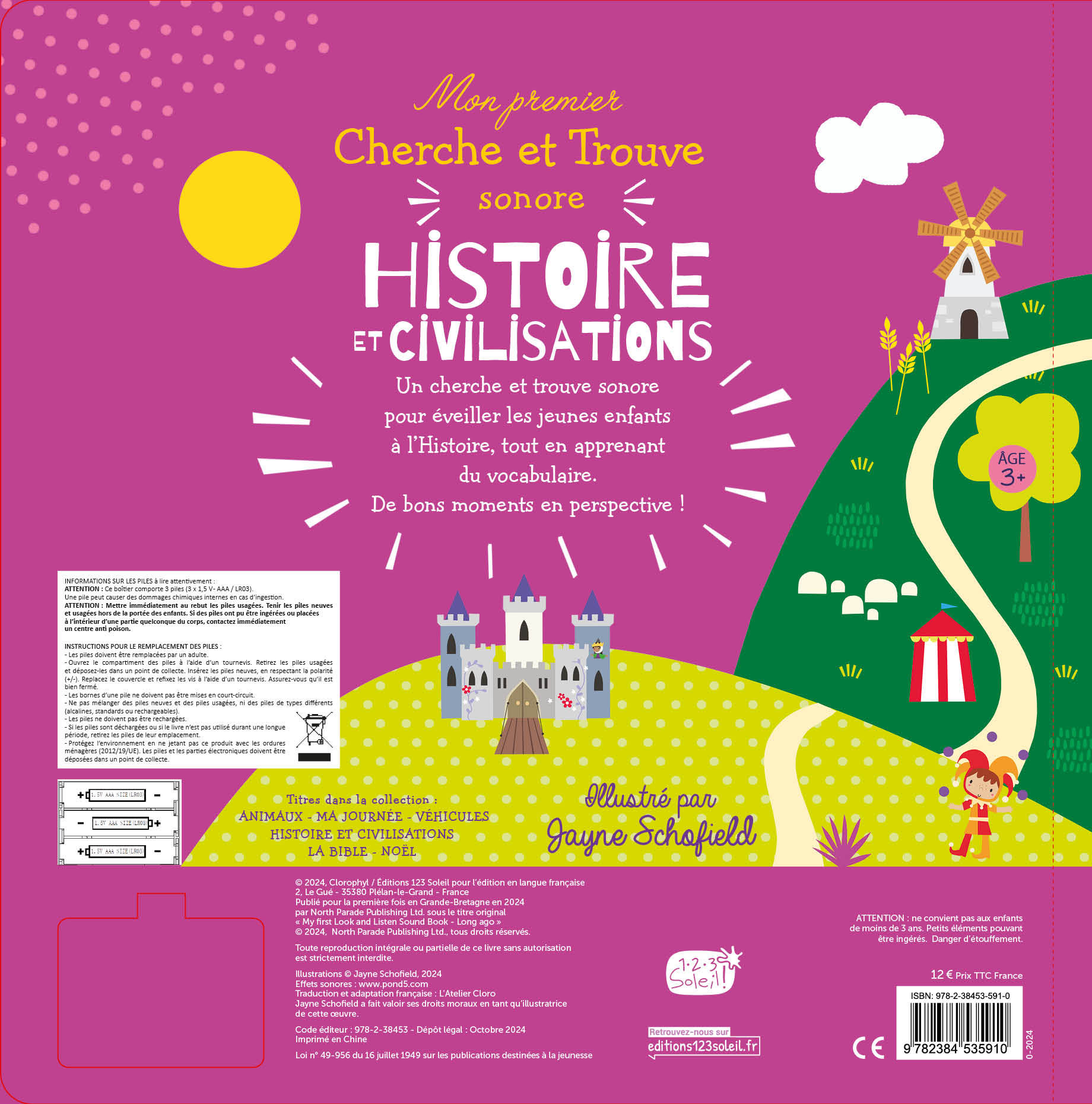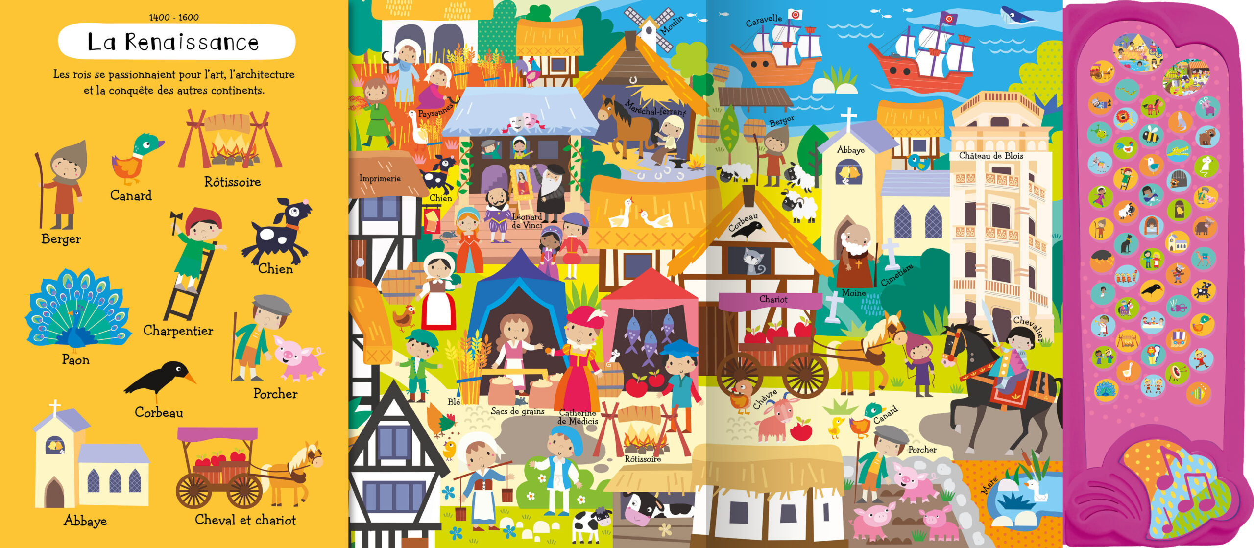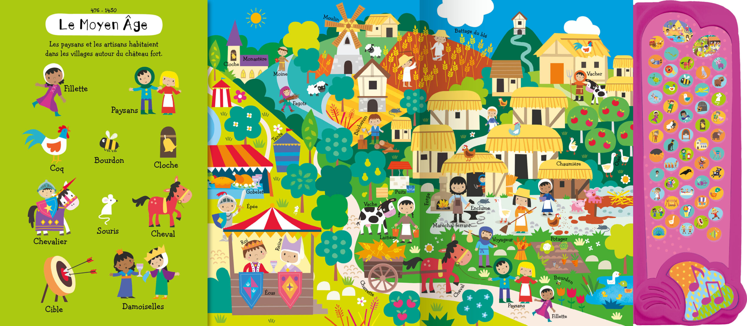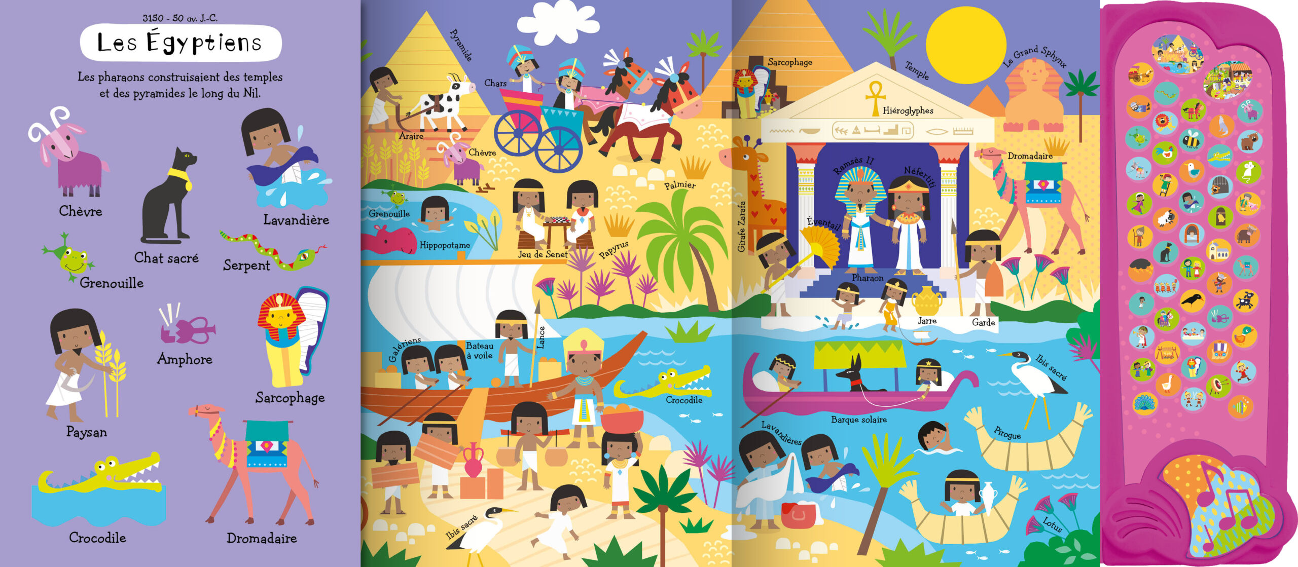 Ce livre sonore grand format propose aux jeunes enfants de découvrir l’Histoire et les Civilisations (les Égyptiens, les Romains, les Vikings, le Moyen-Âge, la Renaissance). Les illustrations tendres et colorées sont de grande taille. Les pages en carton composées de 3 volets s’ouvrent en format panoramique et invitent à chercher les images. Le module sonore propose 50 puces, identifiées par la couleur de la page : un bon moyen pour exercer l’attention et la mémoire visuelle et auditive des jeunes enfants. Les piles sont des AAA-1,5 V, afin de faciliter leur remplacement et la possibilité de les recharger. Un livre bien conçu et très complet pour éveiller à l’Histoire tout en apprenant du vocabulaire.