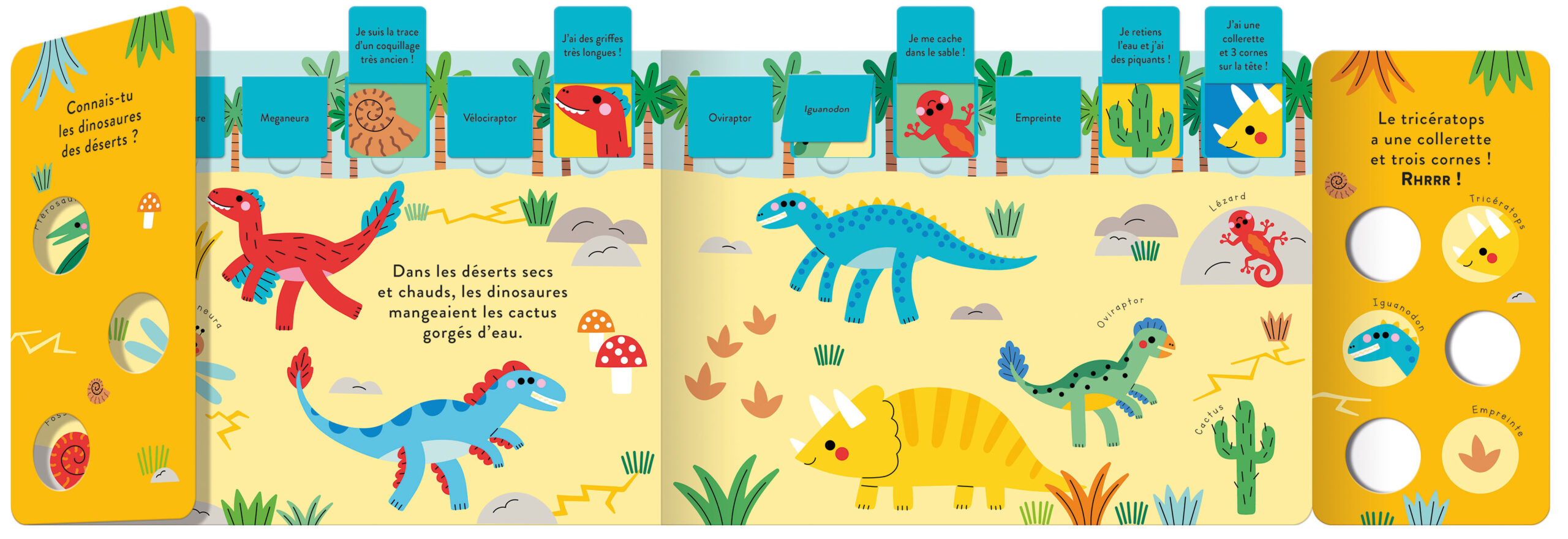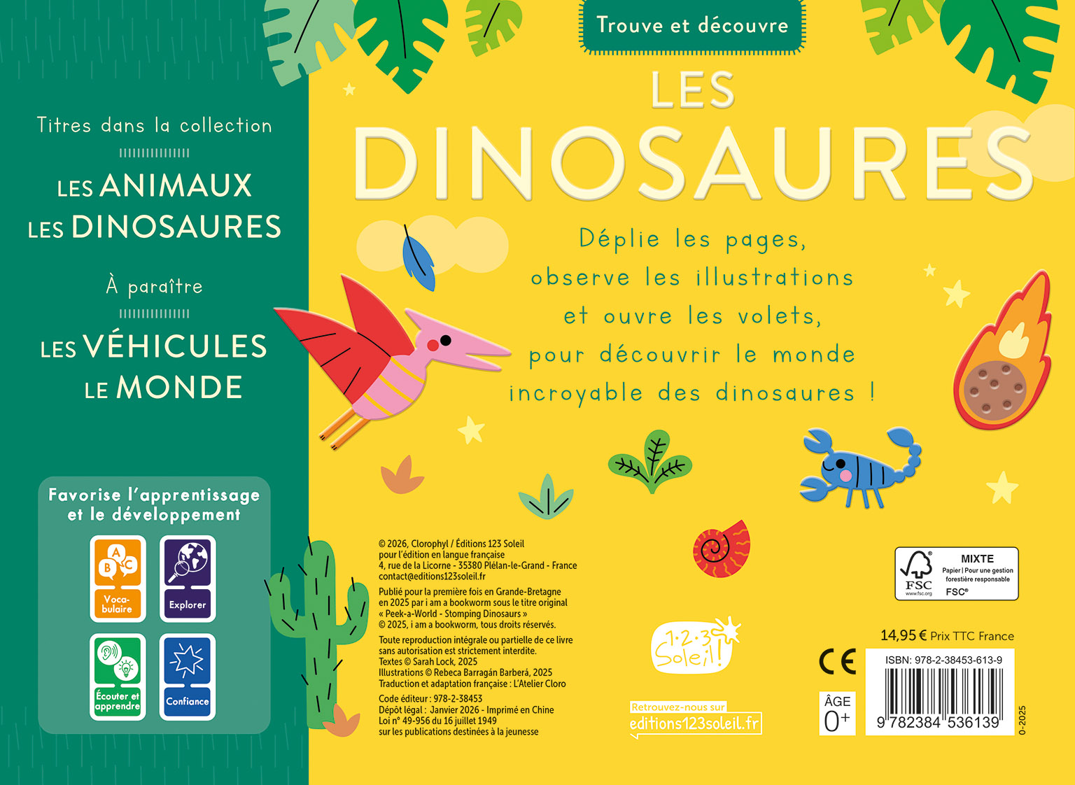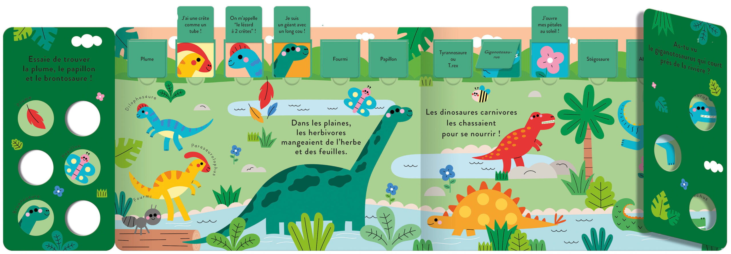 La collection “Trouve et découvre” propose aux tout-petits de partir à la découverte du monde. Les 6 double-pages cartonnés s’ouvrent de chaque côté avec un grand volet percé de fenêtres pour inviter à explorer un détail précis de l’illustration. Sur chaque double-page. 12 flaps à soulever révèlent un animal ou un objet. ainsi qu’une information courte. Les illustrations riches et colorées captent l’attention et encouragent l’exploration. Pleines de détails à observer. elles favorisent l’éveil sensoriel des touts petits. En tout. 12 grands volets et 72 flaps à soulever pour développer l’attention au détail et la motricité fine des jeunes enfants.